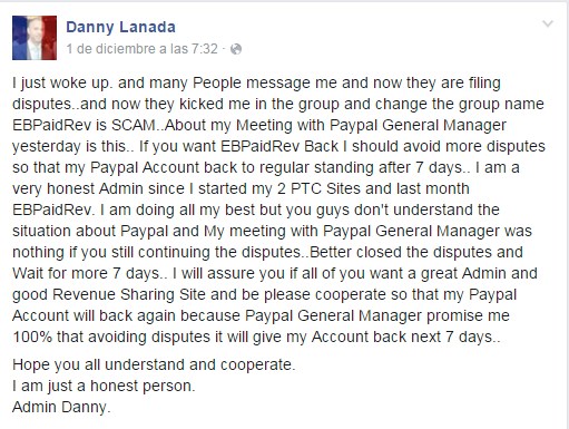 «Me acabo de despertar. y muchas personas el mensaje yo y ahora se están presentando disputas.. y ahora me patearon en el grupo y cambiaron el nombre del grupo a EBPaidRev es SCAM..Acerca de mi reunión con PayPal con el Gerente General ayer es este .. Si quieres EBPaidRev devuelta debo evitar más conflictos para que mi cuenta de Paypal de nuevo a pie regular después de 7 días .. soy una administrador muy honesto desde que comencé mis 2 Sitios PTC y el último mes EBPaidRev . Estoy haciendo todo lo posible pero ustedes no entienden la situación acerca de Paypal y Mi encuentro con PayPal Gerente General no era nada si todavía continuan las disputas.. Mejor vayan cerrando las disputas y esperen más de 7 días .. Voy a asegurarles si todos ustedes quieren un gran administrador y buen reparto de ingresos del sitio y ser por favor cooperen para que mi cuenta de Paypal retroceda de nuevo porque el Gerente General de Paypal me prométe 100 % de que evitar los conflictos que le dará mi cuenta atrás en los siguiente 7 días ..