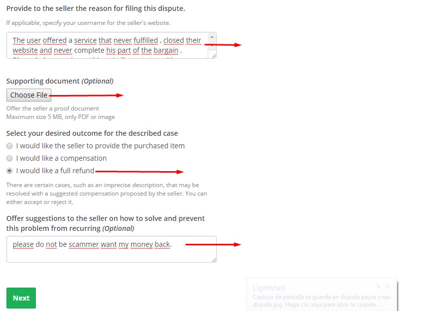 - Provide to the seller the reason for filling dispute: Esta es una de las parte mas importante donde debes de colocar las razones por las cuales estas realizando la disputa. Deben ser claros de porque estan realizando la disputa diciendo la verdad y obviamente haciendo quedar al vendedor como estafador. A continuacion les dejo algunos ejemplos que pueden copiar y pegar en esa parte con los cuales he ganado varias disputas.