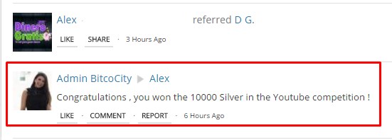 El primer premio que recibí hoy fue en Bitcocity, pagina que promocione hace unos cuantos días en dinero gratis (puedes leer la publicación aquí) y tenia un concurso el cual consistía en hacer un vídeo tutorial en Youtube y compartirlo en esta web. Y los 10 vídeos sobre la web mas vistos recibirían 10.000 monedas pues vaya sorpresa cuando entro hoy como siempre y me topo con un mensaje de la administradora donde me decía ¡que había ganado! y en mi balance 10.000 monedas Silver una belleza. Abajo les dejo el mensaje de la administradora de bitcocity donde me dice que fui uno de los ganadores.